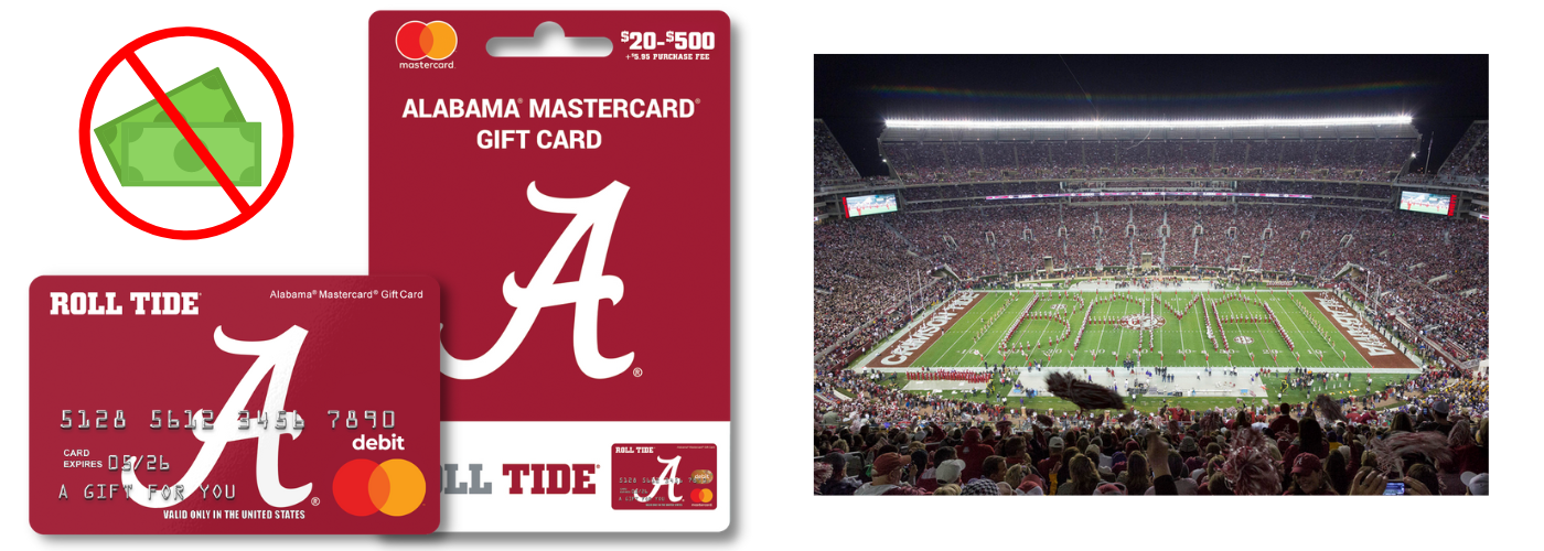 Fancards procured thousands of its Alabama Mastercard Gift Cards in various denominations to help fans who wanted to exchange their cash. Fancards partnered with the University of Alabama’s concessions partner, Levy Restaurants, to set up areas around stadiums where fans could quickly exchange their cash for an Alabama Mastercard Gift Card. Once fans received their gift card, they could use it anywhere in the stadium, and take it home with them and continue spending any remaining funds. Fancards also provided reporting on how much cash was exchanged and at what denominations.